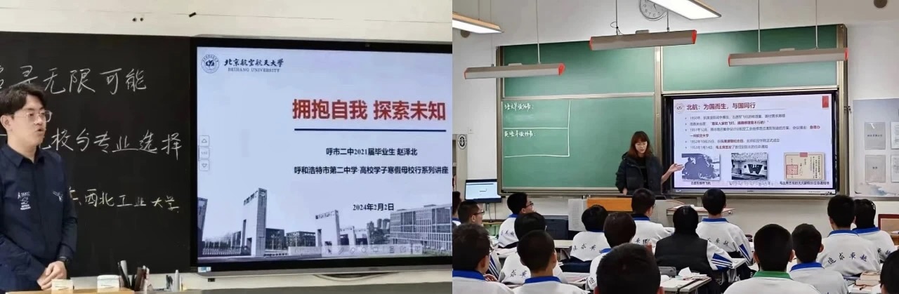 北航内蒙古校友会对内蒙古招生工作给予大力支持。在会长吕霄红、副会长赵鑫磊统筹安排下,内蒙古各地校友配合招生组先后来到鄂尔多斯一中、呼和浩特二中、赤峰红旗中学、包头九中等学校,在沟通宣传、人员保障、物资供应、交通等方面提供大量帮助,有力支持了招生宣传工作的开展。北航校友总会副秘书长黄瑞勇为重点中学开展宣讲。