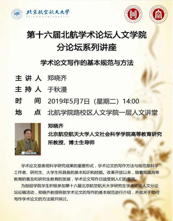 北京亚洲成人在线一二三四五六区研究生学术论坛旨在推动我校各学院研究生学术交流,弘扬优良学术风气。人文学院分论坛隶属于北航研究生学术论坛,现已开展到第十六届。第十六届研究生学术论坛已于2019年4月24日启动,面向全院在校硕士生及博士生,依照惯例沿用网上征稿的形式,进行为期一月的征稿活动。被录用的优秀论文将由学术论坛组委会推荐到《北京亚洲成人在线一二三四五六区学报》《复合材料学报》《航空学报》《航空动力学报》等进行复审和函评。