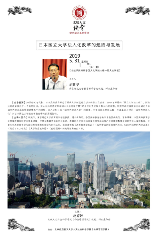 5月31日下午,“北航人文讲堂”举行题为“日本国立大学法人化改革的起因与发展”的学术讲座,本次讲座有幸邀请到南京师范大学教育科学学院教授、博士生导师——胡建华教授,众多师生积极参与,现场气氛活跃。讲座由北航人文社会科学学院(公共管理学院)赵婷婷教授主持。