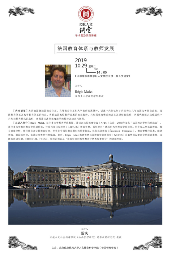 2019年10月29日下午2:00,“北航人文讲堂”学术前沿系列讲座在北航人文社会科学学院人文讲堂内举行。本次讲座邀请了波尔多大学教育学院教授Régis Malet做题为“法国教育体系与教师发展”的学术前沿讲座。讲座吸引了众多师生前来倾听。本次讲座由人文社会科学学院(公共管理学院)高等教育研究院雷庆教授主持。