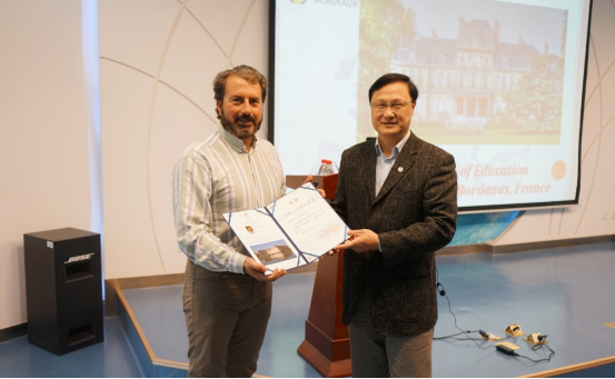 讲座最后,人文社会科学学院(公共管理学院)高等教育研究院雷庆教授代表学院向Malet教授颁发“人文讲堂”纪念证书并合影留念。