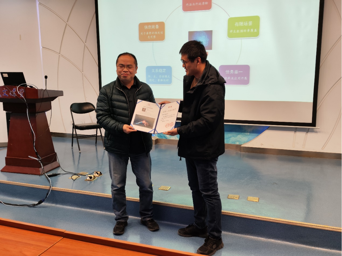 最后,樊文强代表学院向郑勤华教授颁发“人文讲堂”纪念证书。
