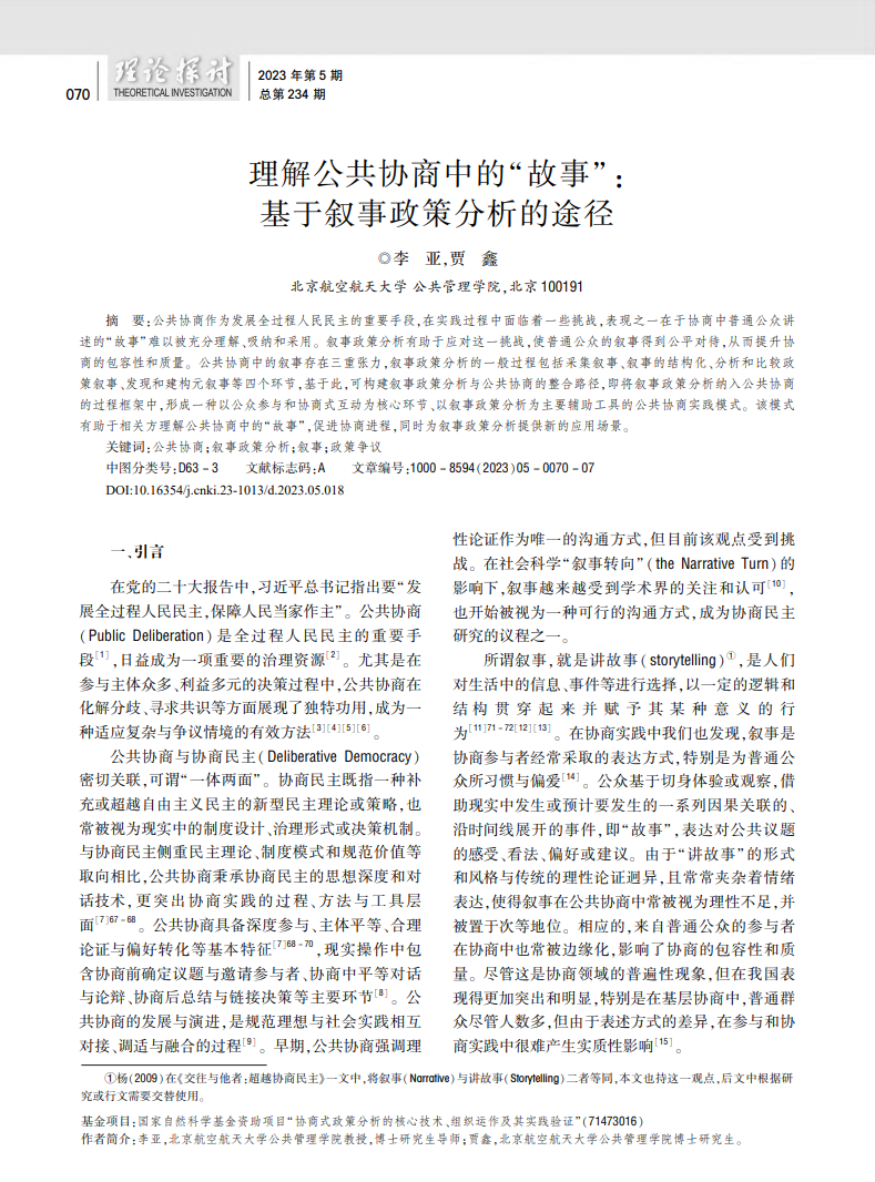 近日,北京亚洲成人在线一二三四五六区人文社会科学学院(公共管理学院)李亚教授和博士研究生贾鑫同学,于《理论探讨》发表《理解公共协商中的“故事”:基于叙事政策分析的途径》一文,以下为文章全文。
