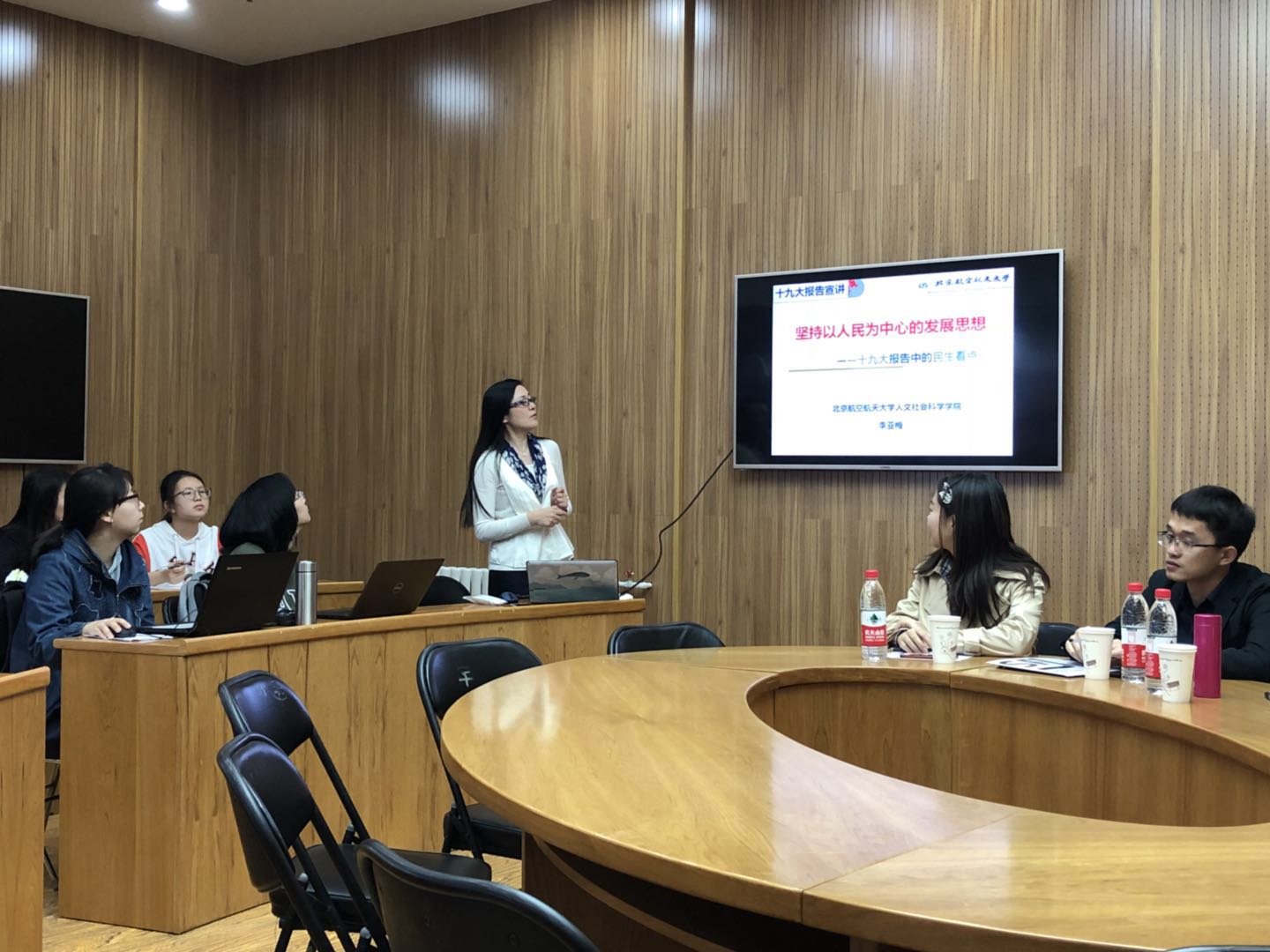 党课开始后,李亚梅老师从民生角度“问道党建”,带来了以《坚持以人民为中心的发展思想》为主题的党课,带领大家学习十九大报告中的民生看点。李老师从就业现状,就业的歧视与维权,收入的结构化改革,劳动者报酬权益维护等方面,生动讲述了“就业是最大的民生”。通过一些精准扶贫案例,李老师阐明不断完善优化社会保障制度,构建有效的社会保险、社会救助、社会福利、社会优抚制度的重要性。在随后的延伸学习中,李老师和在座党员探讨了政府工作所报告中的民生问题,点出“人民”在十三届全国人大一次会议重要讲话中共计出现84次,可见其重要位置。李老师向同学们提供了学习十九大报告的一个重要途径:结合十九大报告原文学,深入实际学。这为党支部继续深入学习十九大精神明确了方式方法。