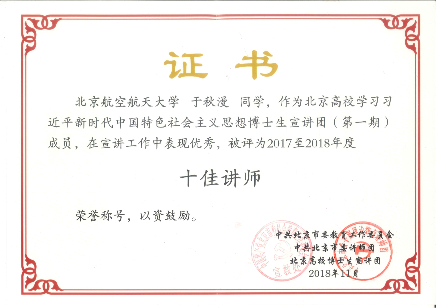 201811月,北京高校学习习近平新时代中国特色社会主义思想博士生宣讲团开展了2017-2018年度“十佳讲师”评选工作,北航人文学院于秋漫、王雪晴从众多讲师团成员150人中脱颖而出,获得“十佳讲师”荣誉称号。这是北航人文学院“知行唯实”小组成员获得的又一佳绩。