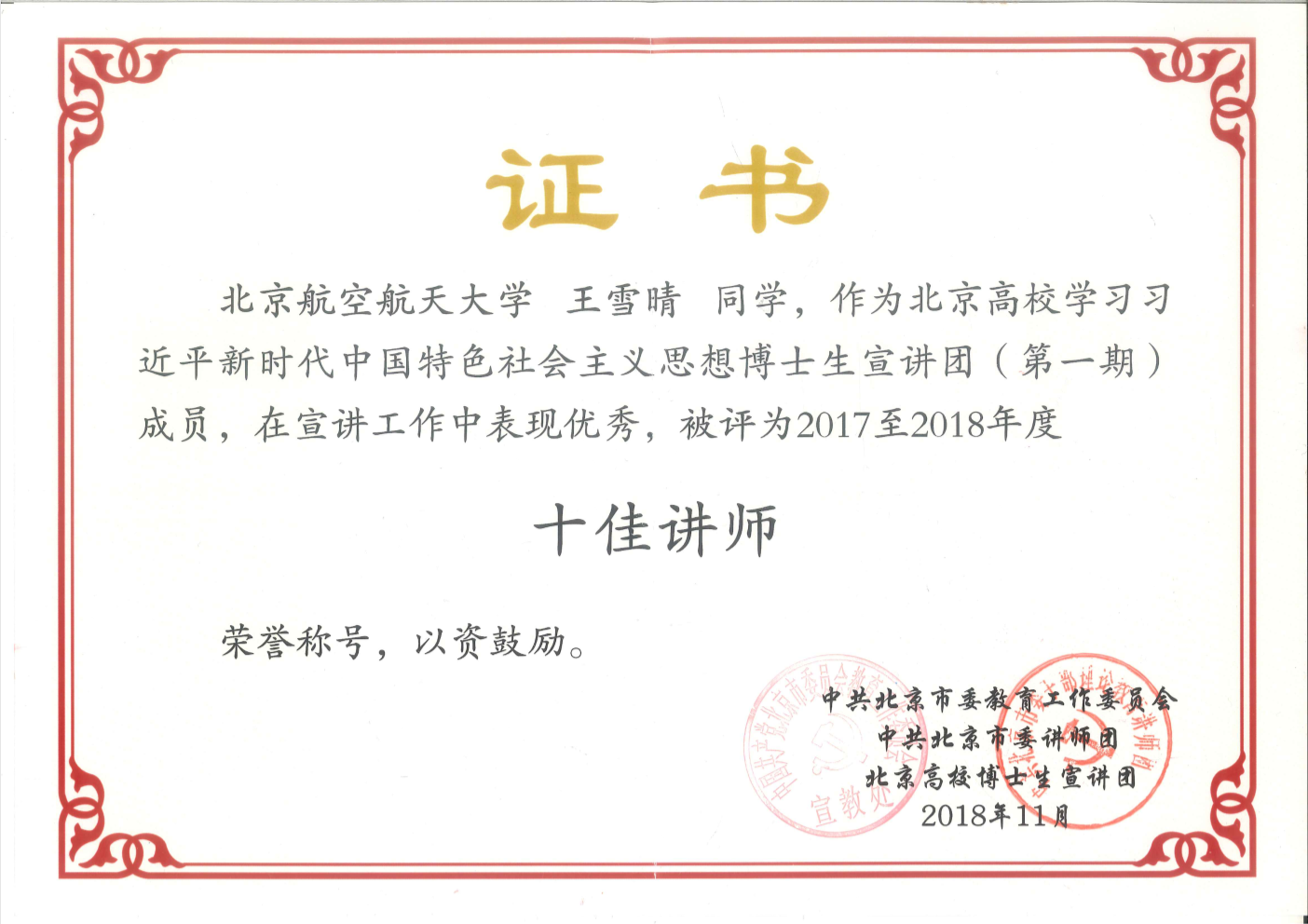 北航人文学院“知行唯实”小组成员荣获北京高校博士生宣讲团2017-2018年度“十佳讲师”称号