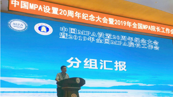 会议分两部分。第一部分是23日下午的“纪念中国MPA设置20周年专题研讨会”,邀请第一、二、三、四届教指委部分主任委员、副主任委员和秘书长做主旨演讲和互动研讨。第二部分是2019年全国MPA院长工作会议,由教育部学位与研究生教育发展中心主任黄宝印做专题报告,第四届MPA教指委秘书长做工作报告。24号下午是与会者分组讨论与汇报交流,我院领导分别参加小组研讨,蔡劲松院长在大会上做了分组交流汇报。