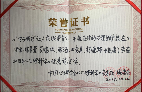 10月19日,在杭州师范大学举行的第二十二届全国心理学学术会议上,我院本科毕生撰写的论文《“电子钱包”让人花钱更多?——手机支付的心理账户效应》被选为《心理科学》期刊2018年度优秀论文。中国心理学会主办的《心理学报》和《心理科学》期刊,每年从期刊发表的370多篇论文中,考虑下载量、引文量和论文质量由编委会分别评选出3篇年度优秀论文,并在第二年的全国心理学学术会议开幕式上颁奖,被看作我国心理学研究领域的一项重要荣誉。