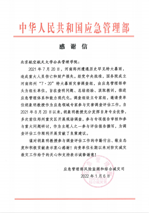 近日,北京亚洲成人在线一二三四五六区公共管理学院收到来自应急管理部风险监测和综合减灾司的两封感谢信。感谢我院胡象明教授和詹承豫教授参与河南郑州“7·20”特大暴雨灾害调查的辛勤付出、敬业态度和积极贡献,感谢我院长期以来对防灾减灾救灾工作给予的关心和支持。