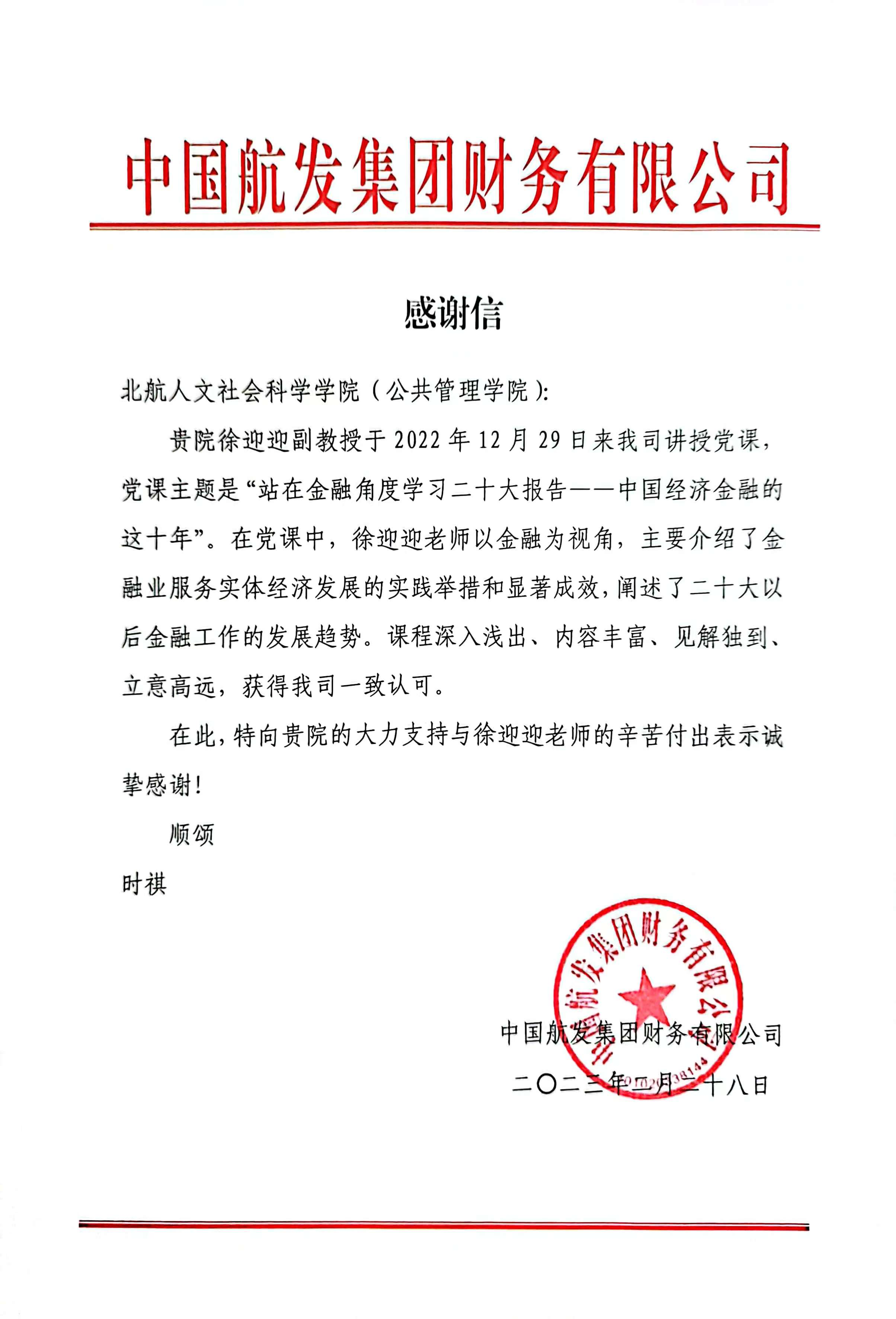 近日,北京亚洲成人在线一二三四五六区人文社会科学学院(公共管理学院)收到来自中国航发集团财务有限公司的感谢信。感谢我院徐迎迎副教授于2022年12月29日赴该司讲授党课,党课主题是“站在金融角度学习二十大报告——中国经济金融的这十年”。