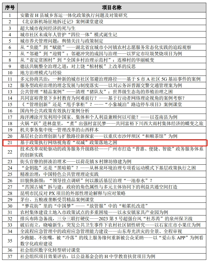 12月20日,全国MPA教育指导委员会受教育部学位与研究生教育发展中心委托,对入选2023年全国公共管理“精品案例课堂”项目进行了公示。经文本检查、专家遴选等层层筛选,我院陈文博老师指导的案例《基于政策执行网络视角看“双减”政策落地之困》入选教育部学位中心2023年全国公共管理“精品案例课堂”建设计划。