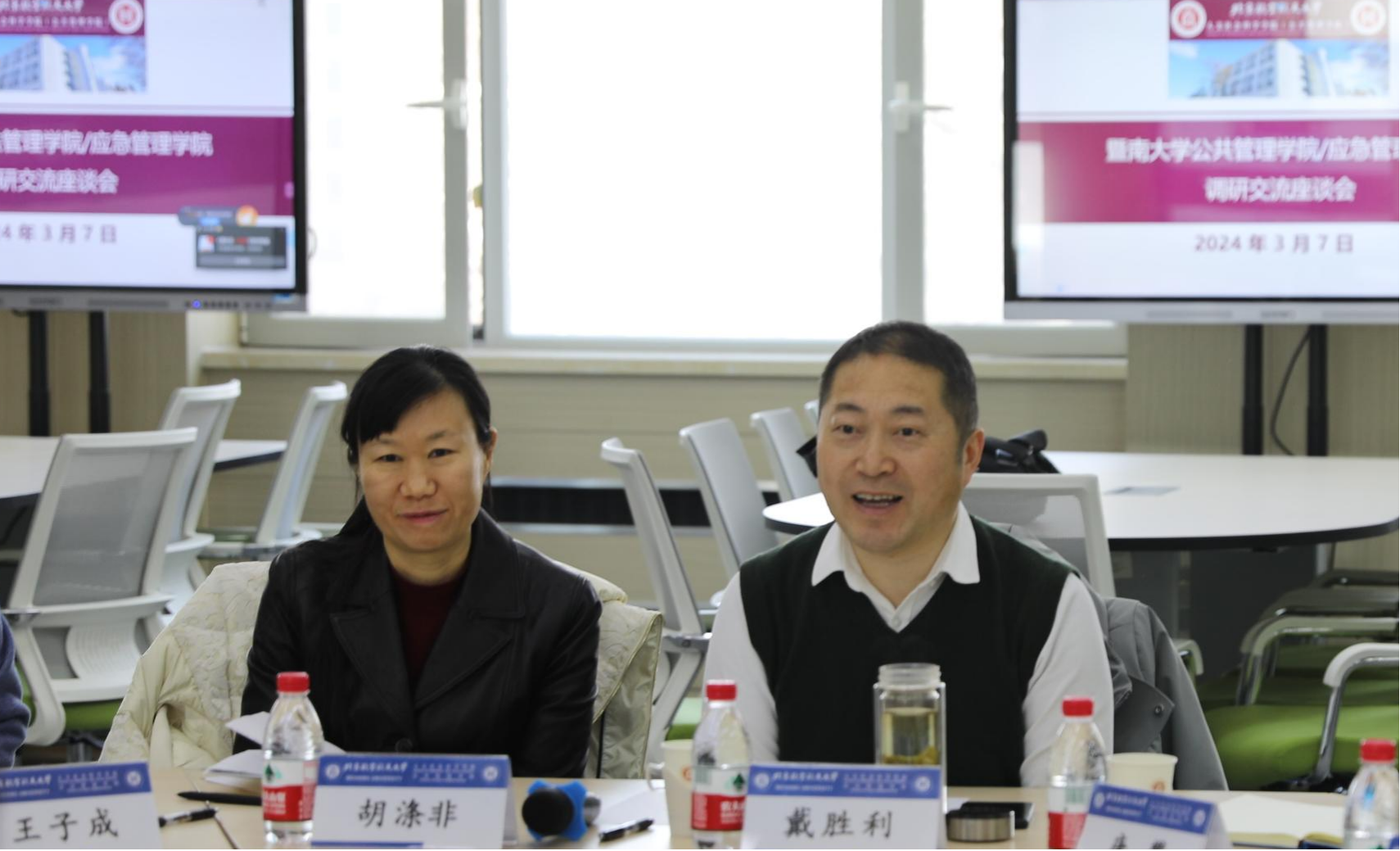 暨南大学公共管理学院/应急管理学院戴胜利院长表示很荣幸在开学之初来到北航人文公管学院进行交流访问,随后介绍了暨南大学公共管理学院的发展现状及此次调研的目的,希望双方能就公共管理学科建设与特色学科方向设置、师资队伍建设与有组织的科研、公共管理博士与硕士人才培养、MPA人才培养等问题展开深入交流。