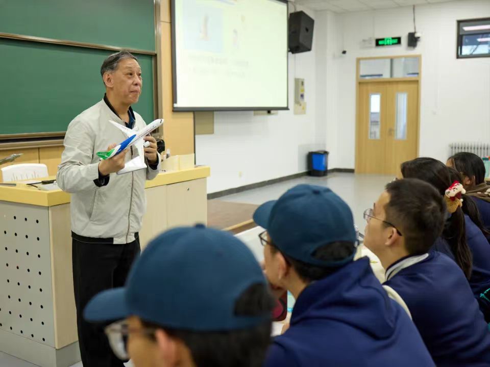 之后,教育部关工委“五老”报告团首批专家、中国科学院老科学家科普讲演团成员、北航航空发动机研究院陈志英教授为师生作《蕴含科学定律的飞行器设计》的精彩报告。陈教授凭借深厚的学术造诣和丰富的科普经验,以生动有趣的方式,深入浅出地讲解了航空航天的基础原理和发展历程。从飞机的飞行奥秘到火箭的发射原理,一个个复杂的科学概念在陈教授的阐释下变得鲜活起来,同学们聚精会神地倾听,不时发出阵阵惊叹,并与陈教授热情互动。学习了知识的同时,同学们对北航的向往也更强烈了。