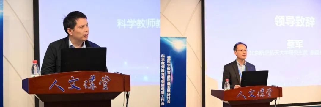 北航研究生院副院长蔡军教授在致辞中介绍了学校在科学教育人才培养方面的创新探索。北航与中国科协、中国青少年科技教育工作者协会一直保有良好合作,在2012年成为教育部与中国科协联合实施的首批“高层次科普专门人才培养”6所试点高校之一,创建了全国首个招收科普教育方向教育硕士的学校,并向中国科技馆输送了首个科普专业教育硕士的毕业生。北航充分发挥特色优势和雄厚实力,构建了“理工+教育”特色培养体系,与中国科技馆、清华附中等单位建立实践基地,已培养200余名复合型科教人才。2023年成为首批“国优计划”高校,2024年输送了全国首位“国优计划”毕业生到清华附中任教,2025年还将有13名毕业生赴重点中学任职。学校依托“智慧互联实验室”等特色平台,深化科教融合,致力于培养具有科技特色的骨干教师。同时,北航积极与中国科协及兄弟高校开展合作,共同探索科学教育师资培养新模式,持续为中小学输送优质师资力量。