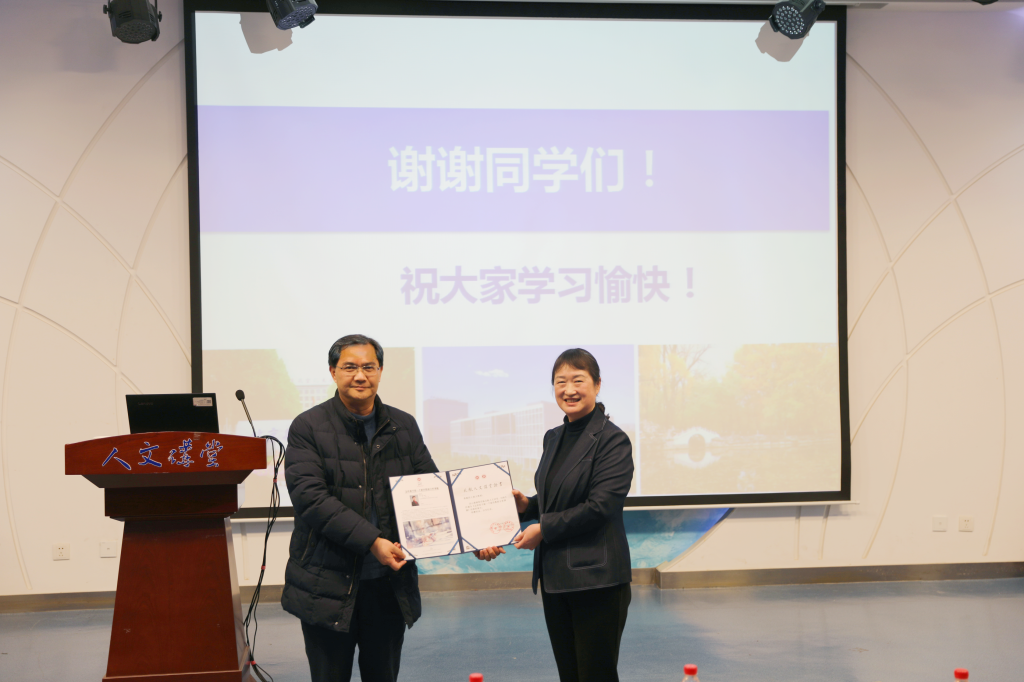 人文社会科学学院(公共管理学院)院长蔡劲松教授代表学院向王惠文教授颁发“人文讲堂”纪念证书并合影留念。