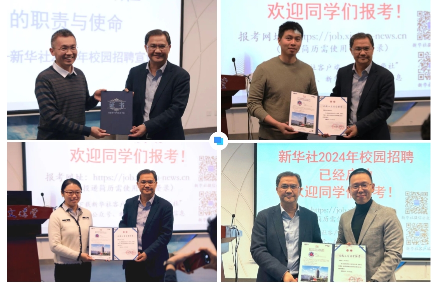 11月15日下午,由新华社人事局、北航学生就业指导服务中心和北航人文社会科学学院(公共管理学院)联合主办的新时代国家通讯社的职责与使命暨新华社进北航校园招聘宣讲会在北航人文公管学院楼一层人文讲堂成功举办。新华社人事局总社人事处处长周文帅、干部徐伟峰,摄影部新媒体采编室主任费茂华、技术局程控电话部副主任苏宇、对外部阿文编辑室主任编辑卜多门、国内部央采中心科技室记者胡喆;北航人文公管学院院长蔡劲松、副院长陈文博、党委副书记方志、专职辅导员张同玉,以及本研学生参加。