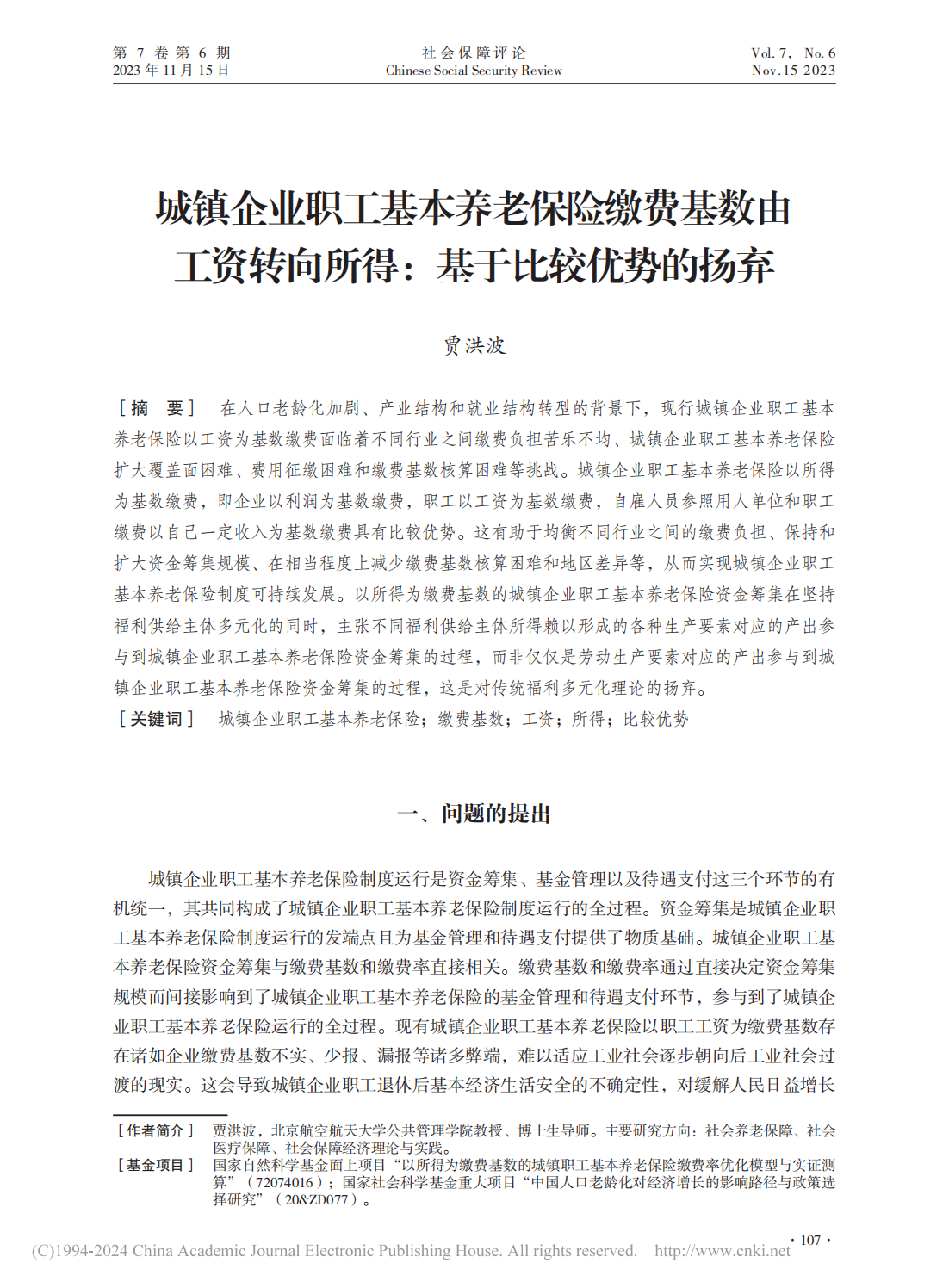 近日,北京亚洲成人在线一二三四五六区人文社会科学学院(公共管理学院)教授贾洪波在《社会保障评论》发表《城镇企业职工基本养老保险缴费基数由工资转向所得:基于比较优势的扬弃》论文,以下为文章全文。