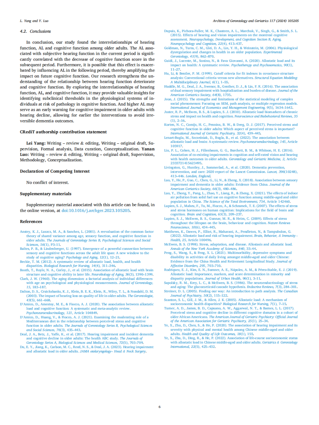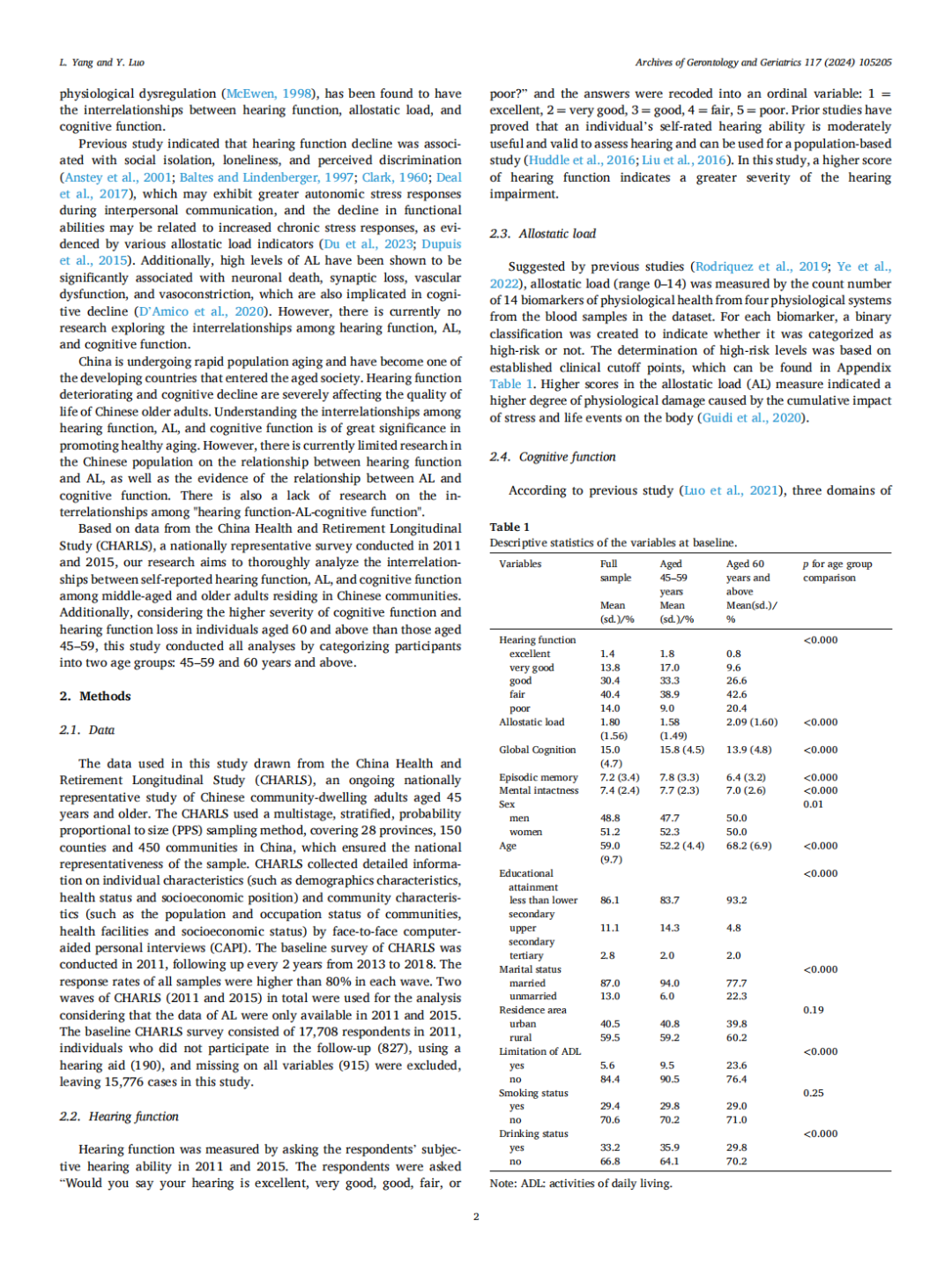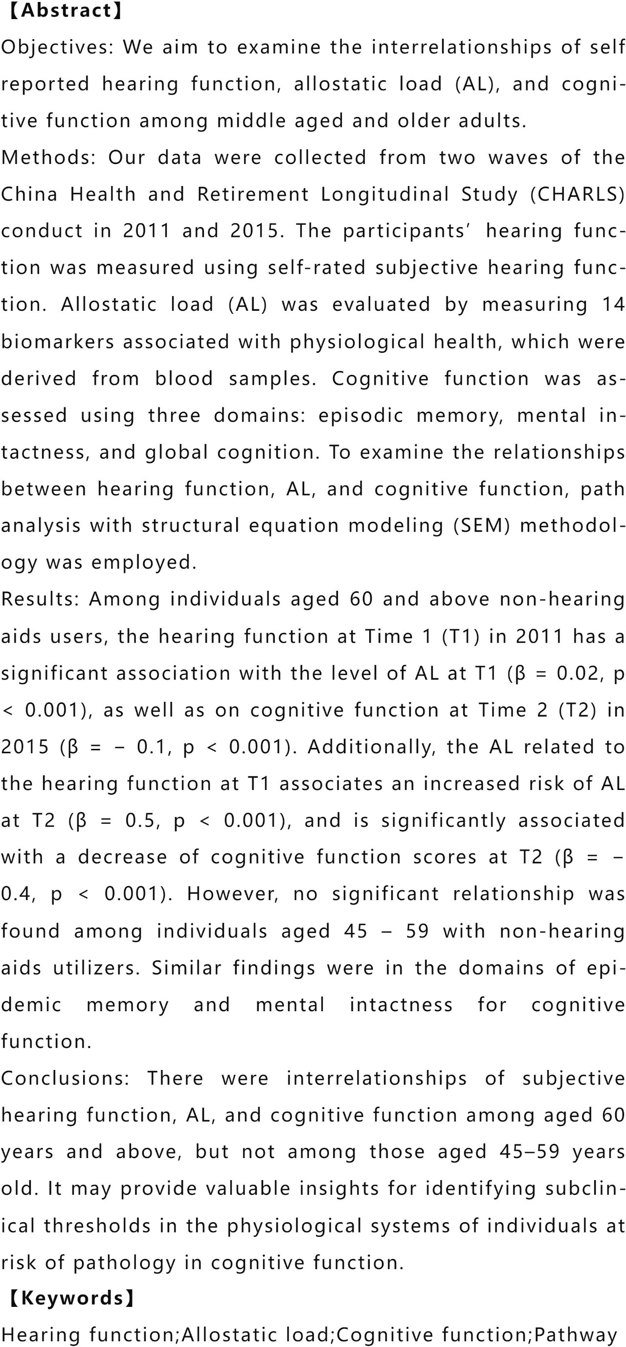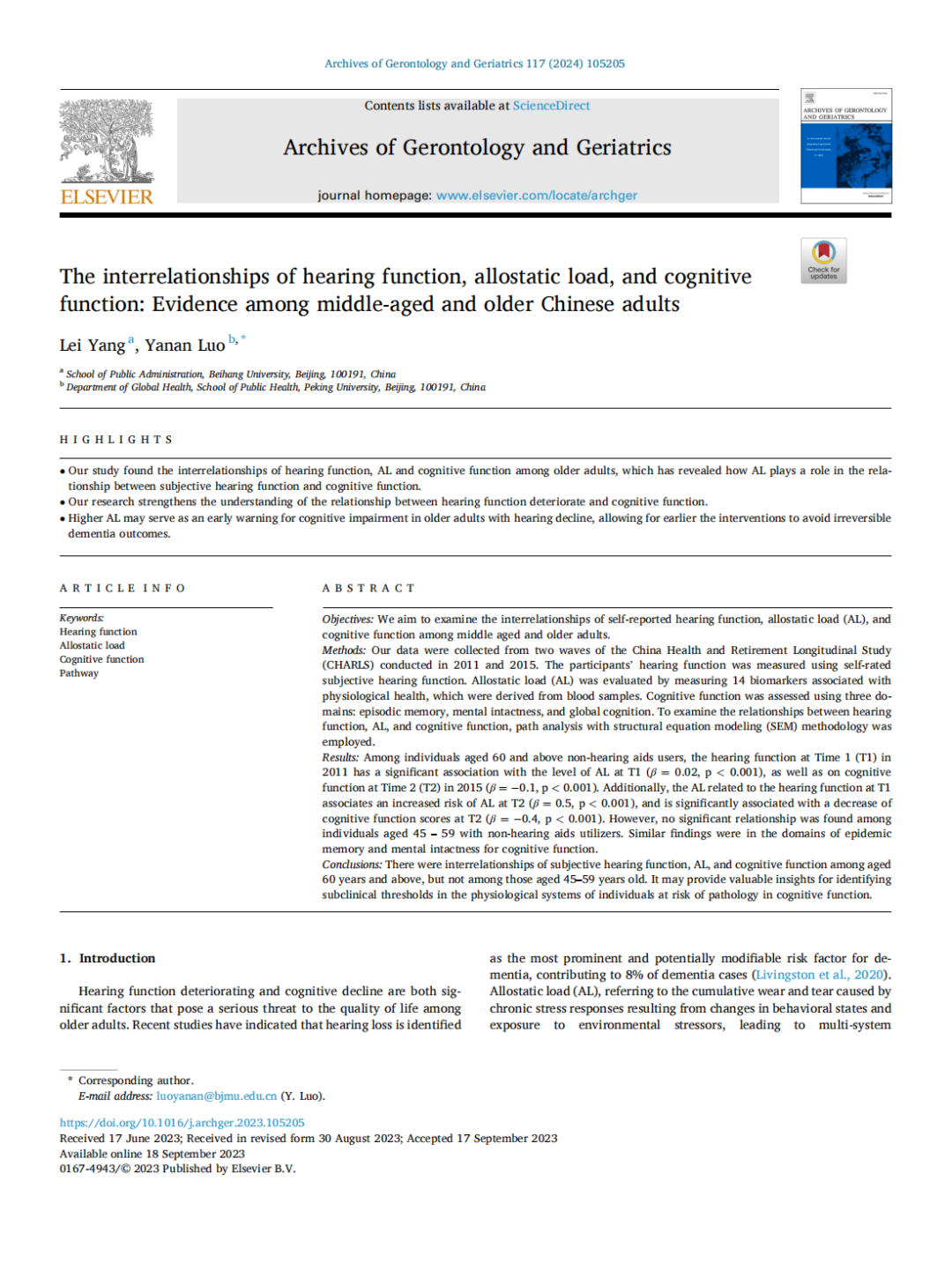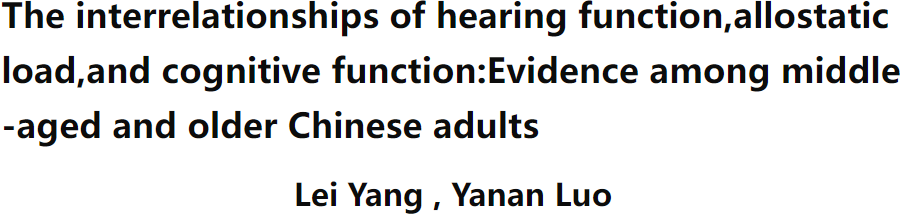 近日,北京亚洲成人在线一二三四五六区人文社会科学学院(公共管理学院)杨磊副教授与北京大学公共卫生学院罗雅楠副研究员合作的文章《The interrelationships of hearing function,allostatic load,and cognitive function: Evidence among middle-aged and older Chinese adults》在SSCI期刊《Archives of Gerontology and Geriatrics》上发表,以下为文章全文。