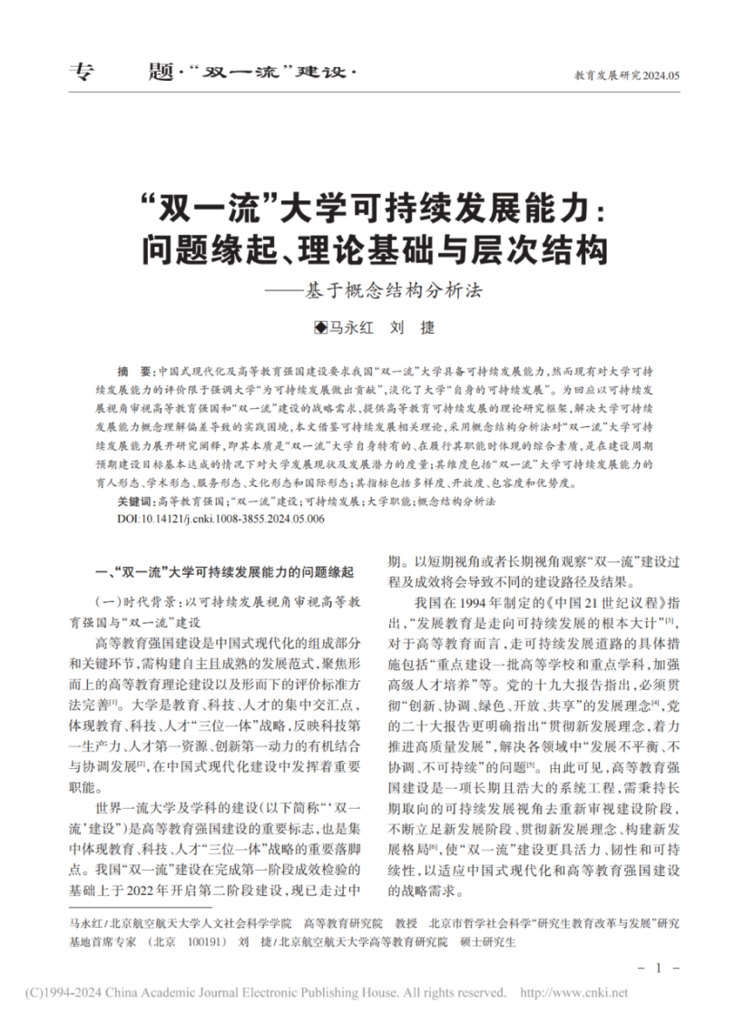 近日,北京亚洲成人在线一二三四五六区人文社会科学学院(公共管理学院)马永红教授、硕士毕业生刘捷撰写的《“双一流”大学可持续发展能力:问题缘起、理论基础与层次结构——基于概念结构分析法》(原刊发于《教育发展研究》2024年第5期),被《人大复印报刊资料·高等教育》2024年第8期全文转载。以下为文章全文。
