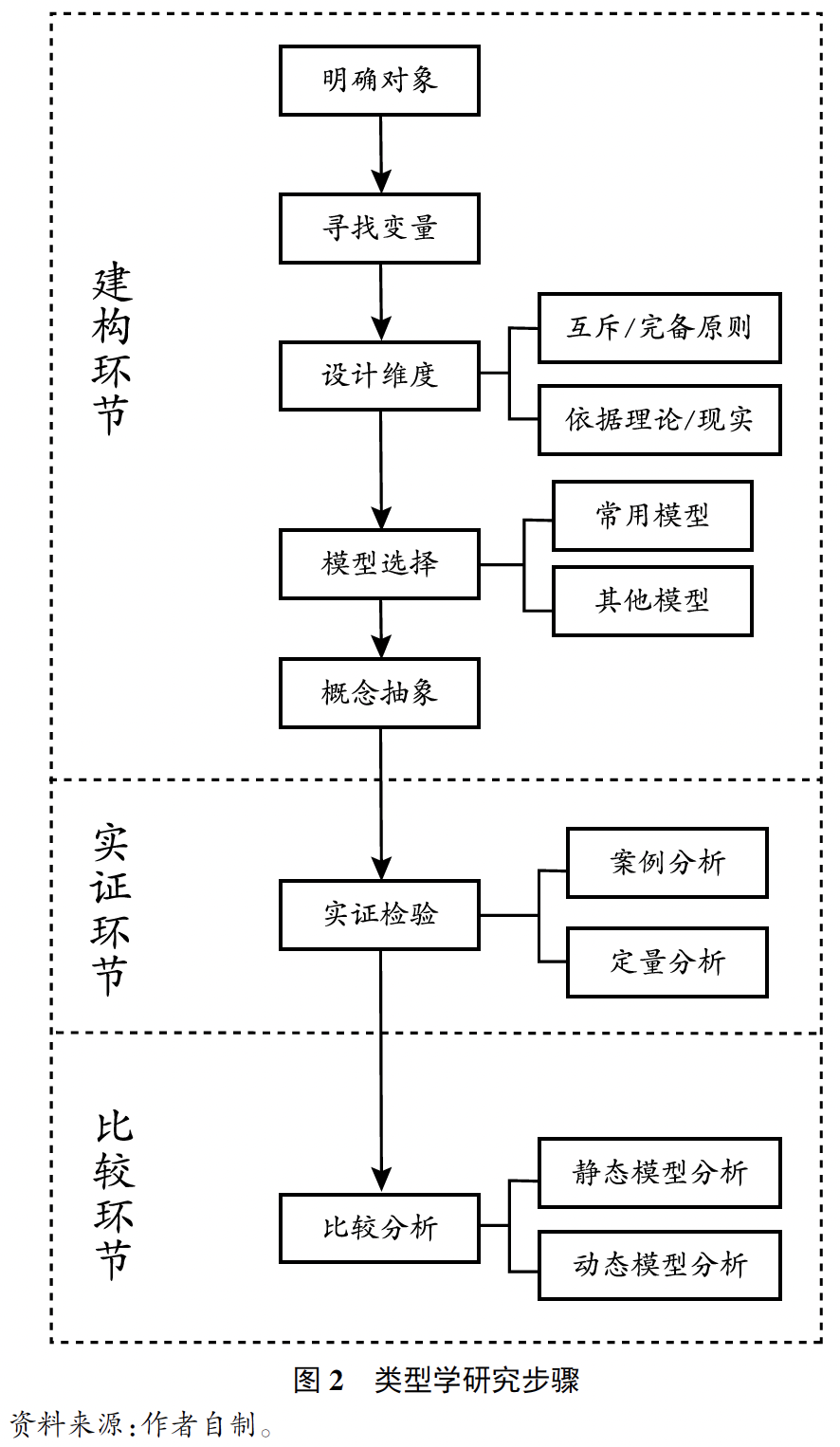类型学建构的理想类型是根据研究者的实践与学术价值耦合的一种思维图像,是一种“方便使用”的概念分析工具。研究者抽象社会现实特征,在思想层面搭建的一套普遍性的、完美的和纯粹的“乌托邦”秩序。与之相反,实践活动的具体性与特殊性促使行为在落地实践过程中不断抽离理想要素,因而,想用理想类型衡量现实,需要提前确认理想与现实的距离,并解释距离存在的原因。通过现实情形与理想类型对比包含了类型学方法的三种意义:一是考察了现实情形;二是检验了研究者的学术建构想象力;三是动态分析了不同理想类型互动与转化的机制。类型学方法没有固定的研究范式,其应用结果也会根据具体细节选择不同而发生变化。综合现有文献,将类型学遵循的研究路径总结为“建构-实证-比较”三个环节(见图2所示),进一步可细分为明确对象、寻找变量、设计维度、模型选择、抽象概念、实证检验和比较分析七个步骤。