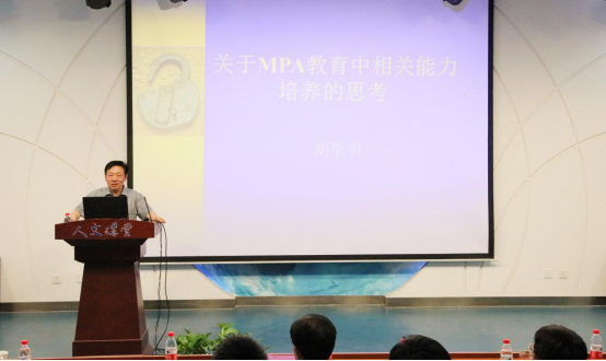 学院学术委员会副主任胡象明教授做了题为《关于MPA教育中相关能力培养的思考》的报告。胡象明教授提出研究生应具备的六种基本能力,即学习能力、获取信息能力、思维能力、创新能力、学术能力与实践能力。而MPA相比于学术型研究生,更强调职业性、应用性和实践性,这也是MPA研究生能力培养的方向。其中胡象明教授特别强调了实践能力,将其分为领导能力、决策能力、沟通能力、语言表达能力、应用写作能力和执行能力。进而胡教授提出MPA教学培养改进的建议。