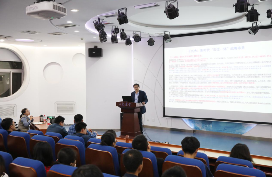 蔡劲松院长指出,十九大以来,基于满足人民日益增长的美好生活需要、推进人类命运共同体建设的愿景,将文化建设与经济建设、政治建设、社会建设、生态文明建设相并列,共同构成“五位一体”总体布局,并从提高国家文化软实力的高度,对文化管理体制改革、公共文化服务体系、文化创意产业、文化传播交流等方面,作出了战略部署和路径安排。随后,他通过几个案例生动讲述了借助现代传媒、科研设备,传统文化在新时代焕发了新的活力和生机。故宫文物揭下神秘面纱、与大众近距离接触;《中国诗词大会》《朗读者》再度燃起国学热、文化热;浙江乌镇探索出当代元素与传统乡村碰撞融合的可能性;新媒体技术使中国传统绘画的艺术神韵立体呈现,让在场师生直观感受到了新传媒与新技术带给传统文化的新魅力。
