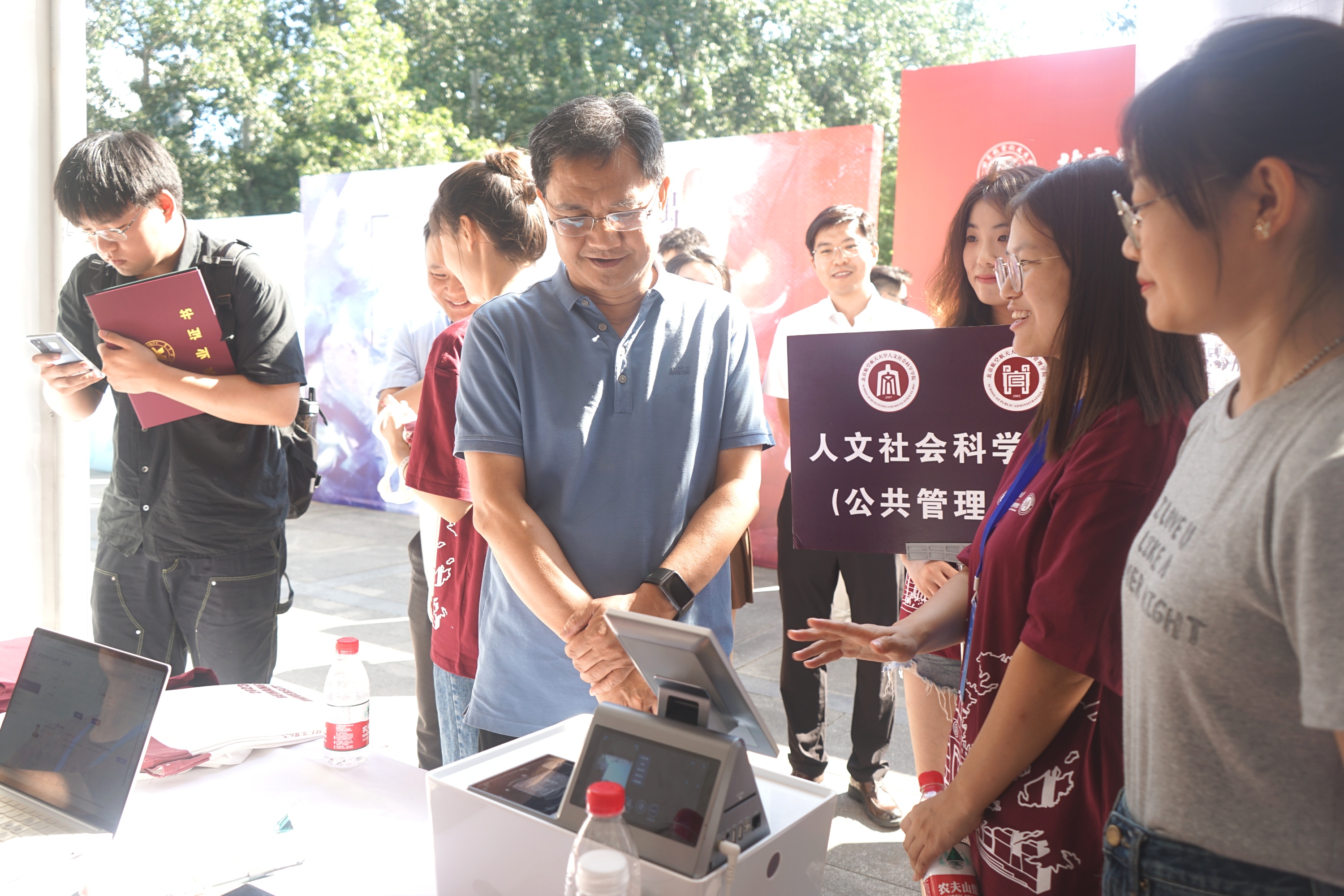 同学们在迎新志愿者的引导下来到学院迎新展位,通过人脸识别、出示录取通知书及身份证件等,有序完成注册报道,并领取学院为同学们准备的新生礼包。报道完成后,同学们与家人朋友纷纷在人文公管学院展板前合影留念。